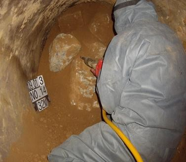 <그림 4> 수평관내 인력 굴착(좌) 및 내부 그라우팅 주입(우)