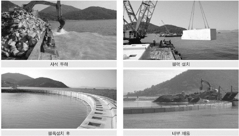 - 마운드 위에 콘크리트 블록을 쌓아 올려 인공섬의 외측 안벽을 시공한다.