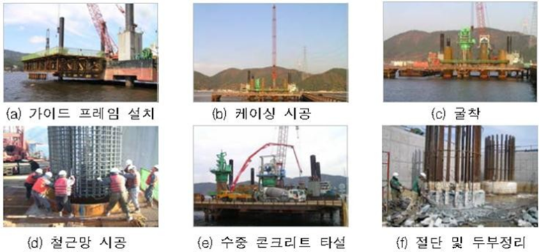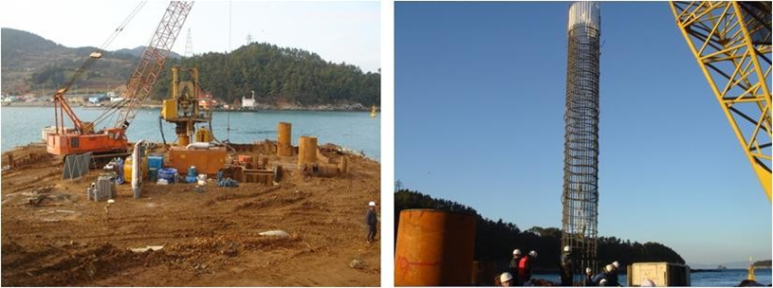 (2) 현수교 및 사장교 주탑 기초에 최근 주로 사용되는 있는 축도(인공섬)후 RCD 현장타설 말뚝공사의 시공순서는 일반적으로 다음과 같다.