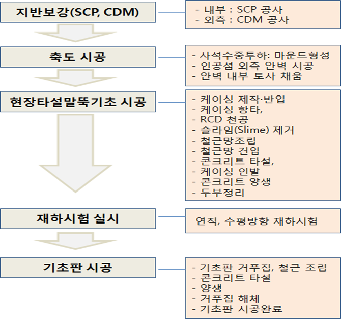 <그림 3> 축도(인공섬)후 RCD 현장타설말뚝 시공순서